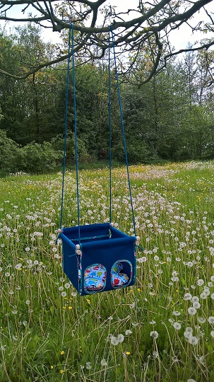 Schommelen is leuk en ontspannend. Je waant je toch even in de lucht en hebt het gevoel dat je zo vrij als een vogel bent. Schommelen is een vorm van meditatie. Door het ritme van het schommelen kun je de eenvoud van het moment waarderen en als je om je heen en naar de lucht kijkt, besef je hoe klein je bent in het grote heelal. Schommelen is goed voor de ontwikkeling van kinderen, zo las ik in een artikel van Jami Murduck. Ze is playground professional op een vrije school. Schommelen helpt onze hersenen om zintuigelijke informatie te verwerken. Doordat kinderen de heen en weergaande beweging maken wordt het evenwichtsorgaan beter ontwikkeld. Hierdoor zijn we als kind en volwassene beter in staat om ons lichaam te coördineren. Hier heb je iedere dag profijt van bij gewone dagelijkse handelingen als schrijven, knippen en snijden. Ook worden onze benen, armen en romp sterker door de bewegingen van een schommel. Bij het lezen van dit fascinerende artikel kwam ik op het idee om een schommel te maken voor de allerkleinsten. De schommel moet veilig, lekker zacht, vrolijk en praktisch zijn. Deze is gemaakt van restjes canvas, een stok die er nog lag en nylonkoord. Je kunt deze schommel zowel binnen als buiten ophangen. Ook makkelijk mee te nemen op vakantie.