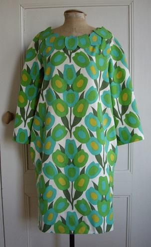 Met de eerste sneeuwklokjes in bloei, kwam ik dit gordijn tegen in mijn bewaarkist! Het is mijn slaapkamergordijn van vroeger, toen ik nog een klein meisje was. Het doet me denken aan bloemen plukken in de wei, grote bossen gele boterbloemen en de pinksterbloemen die we plukten voor mijn moeder, oma, buurvrouw en juf. Ik zie ze nog bij mijn oma in een glazen weckpot staan. In de vakantie logeerden mijn nicht en ik vaak bij oma, we gingen dan altijd op de fiets naar de stad. Op een keer mochten we twee ballen uitzoeken, ik koos voor een blauwe en een groene en mijn nicht zei: ‘dat kan niet hoor, dat vloekt!’ Ik had er nog nooit van gehoord, maar ik bleef erbij dat ik deze kleuren het mooiste vond. Het is nog steeds één van mijn favoriete kleurencombinaties. Voor deze jurk heb ik hetzelfde basispatroon gebruikt dan de vorige. Ook dit gordijn is van Ploegstoffen Holland. Die maakten prachtige kleurencombinaties en patronen met een heel mooie kwaliteit linnen en katoen. De stof is nu nog steeds prachtig. De tulpjes heb ik uit de stof geknipt en langs de hals vastgezet. Nu mag het voorjaar wel komen!