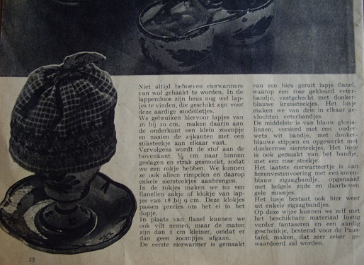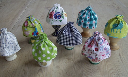 Bij het opruimen van de zolder vond ik een oude doos van mijn moeder met een Libelle over haken en breien uit maart 1950. Al bladerend kwam ik deze eierwarmers tegen. Dat bracht me op het idee om ze te gaan maken van restjes stof uit de lappenmand. Alvast voor de paasbrunch die we altijd organiseren voor de familie. Zo heb ik voor ieder een persoonlijke eierwarmer gemaakt. Zo houdt de één van retro, de ander van zwart-wit en weer een ander van schapen, meisje-meisje. Gek op groen of bloemen en vogels, het kan allemaal. Krijg je al inspiratie? Ze zijn heel gemakkelijk zelf te maken en daarom doe ik de beschrijving erbij.